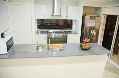 ^ Modern kitchen with stone benchtops, gas cooking & stainless steel appliances.