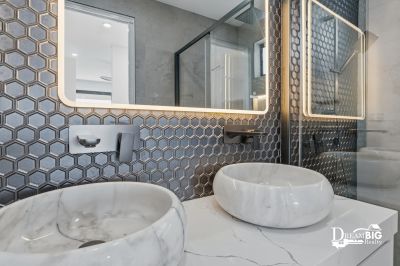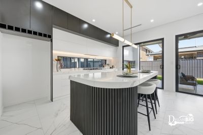 * Statement 80mm AC 888 curved stone benchtops in the kitchen, continuing seamlessly through all vanities